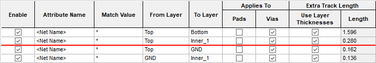 A Layer Change Length is an additional length provided to a signal when passing through a via or pad. By default, track lengths are calculated without taking any account any additional layer change lengths. Where track lengths are critical, the rules on this dialog enable you to specify additional lengths for vias and pads.