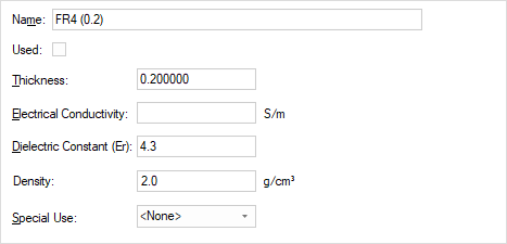 The Special Use parameter specifies if the material has a special use within the system. Hole Plating means the material is used to plate normal holes, and Micro-Via Hole Plating is the material used to plate micro via holes. Each special use type can only be applied to one material. The values on materials are used by the Via Resistance Calculator.