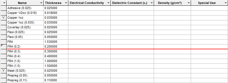 Any Materials defined can be used within the Layers dialog. If a thickness is defined for a Material, this will be the default thickness for the layer. In the Layers dialog it will contribute to the total Board Thickness calculated for all combined layers within the stack.