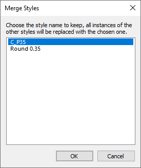 You have already pre-selected the styles that you wish to be merged. In this dialog, you now pick the one style name that will become the new master name. Once you press OK, the styles will be merge and the styles page in the Technology dialog updated.