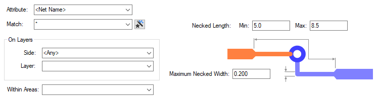 The Maximum Necked Width defines the maximum track width that is considered necked, necked tracks must be less than this value. This is an actual width used regardless of the Net Styles Track Styles defined or the actual Track Style used. This rule ensures that a necked track thickness is not violated.
