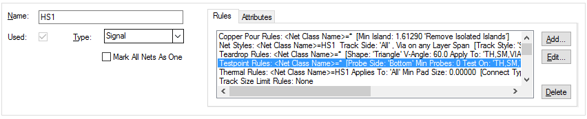 Any rules or Attributes defined for the Differential Pair or Differential Pair Chains will be show here. Use the Add, Edit and Delete buttons to add or edit extra rules or attributes. More information about editing these fields can be found on the Rules and Attributes help page.