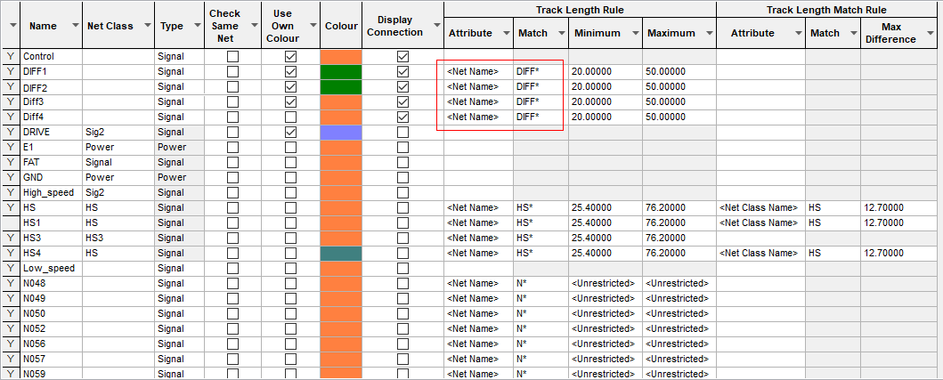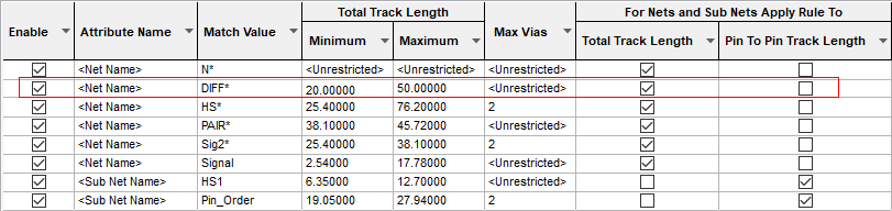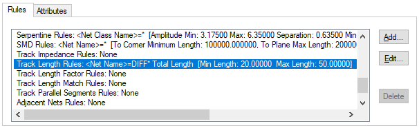 When using the Track Length Rule and Track Length Match Rules, an alternative is to write the rule directly into the dialog that requires it, such as the Net Name or Differential Pair or Signal Paths etc. Once the attribute (Rule) is written, it then becomes a rule within its own right and appears in the relevant Rules page where it is available for use on other nets.