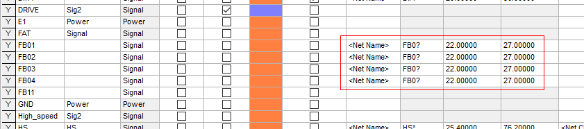 To do this: write the rule into the Attribute cell along with the Match and Values to be used. In the example below, the <Net Name> system attribute has been selected. The typed Match will be FB0? with values of 22.0 and 27.0 for Min and Max Track Lengths respectively. This then matches the Net Names of FB01-04 but not FB011 (? will only match one character).