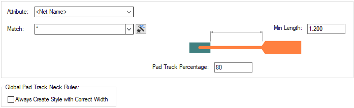The appropriate Pad Track Neck rule is found for each net item by working down the list of rules until the first match is found. Hence, the order of the rules is important. A match is when the specified Attribute Name and Match Value match attributes of a net item. So the Pad Track Neck rule must have the given attribute, and it’s value must wildcard match the value.