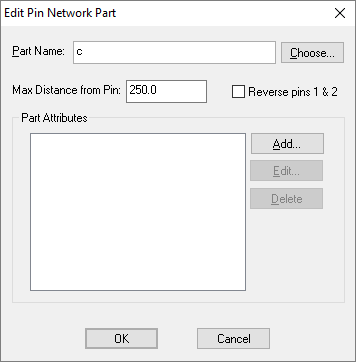 You must give the name of the part to use, a network can contain more than one of the same part. The part would normally have exactly 2 pins. At this stage the part does not have to exist in any library, but would obviously need to be created before the Pin Network is used. You can type the part name straight into the edit box or press the Choose (part) button to select an existing part from a library.
