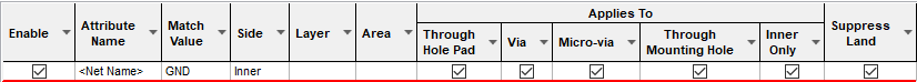 The appropriate rule is found for each net or pad by working down the list of rules until the first match is found. Hence, the order of the rules is important. A match is when the specified Attribute Name and Match Value match attributes of a net or pad. So the pad (or net) must have the given attribute, and it’s value must wildcard match the value.