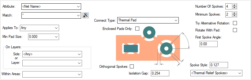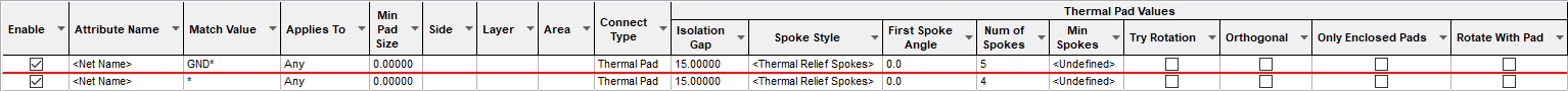 In general, you will probably use the same thermal pad rules for most nets, with just a few special exceptions which can be defined using the methods described here. For example, high power sub nets may need more spokes and a larger gap.