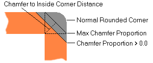 The size of the chamfer is controlled using the Chamfer Proportion. The value gives the distance between the inside corner and the outside chamfer as a proportion of the track width (or the minimum width if the two track segments are different widths). So a value of 0.5 and a track width of 20 thou would cause the distance between the inside corner and the chamfer to be 0.5 x 20 = 10 thou. The value can be between 0.0 and the reciprocal of the square root of two (0.707107).