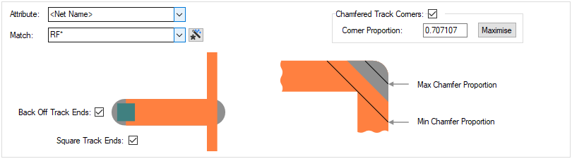 The Track RF Rules dialog is used within the High Speed Rules option to specify how the track ends are finished and to specify whether track corners will be chamfered and the proportion of chamfer.