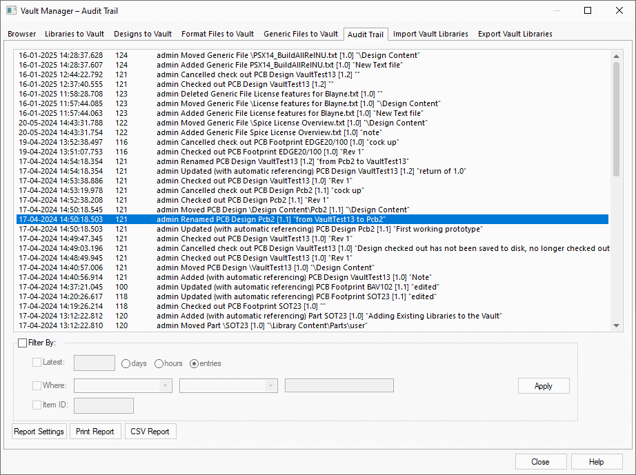 The Audit Trail is where Pulsonix Vault records all significant actions carried out on your Vault. You can examine the contents of the Audit Trail (if you have sufficient permissions) from the Audit Trail page of the Vault Manager dialog.