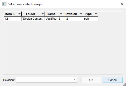 Use this dialog to associate a generic file with an existing Vault design. To do this, click on the desired design in the grid. Then select the revision of the design you wish to associate with and click OK when finished.