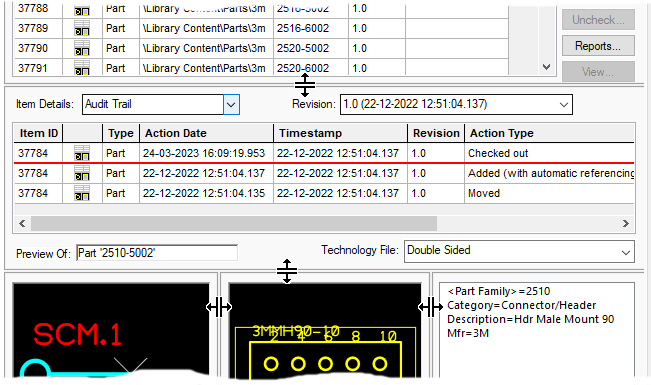 Selecting this mode will show you all the items used by the selected one, for example all the Parts and Footprints used by a Design file, or all the Footprints, Symbols and Associated Parts used by a Part. This mode can be useful for getting an overview of the revisions of all the library items used by a particular file.