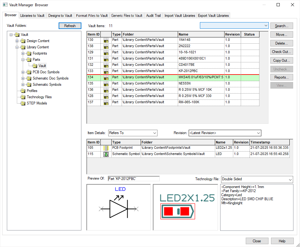Selecting this mode for the Item Details view will show you all the places in the Vault where the selected item is used. You can use this, for example, to quickly find all the Parts which use a particular Footprint, or even all the Designs that use a specific Part.