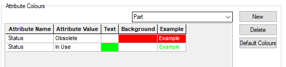 You can also colour items based on their attribute values. After selecting an item type from the drop down box, you can add or remove Attribute Colour Rules associated with that type. The Attribute Colour Rule options will become available once your connected Vault database is updated to the correct format version.