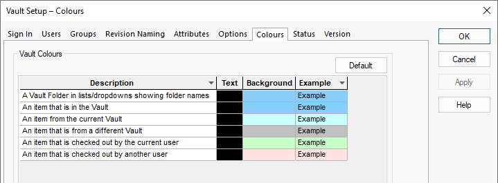 Throughout the application colour is utilised as means of highlighting and distinguishing various elements of the Vault interface. This dialog allows the colours used to be modified and tailored to meet an individual users particular needs.