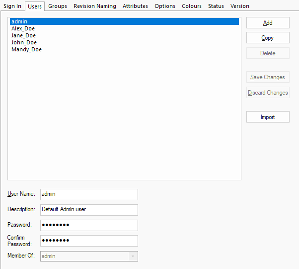 Vault Overview | Sign In | Users | Groups | Revision Naming | Attributes | Options | Colours | Status | Version