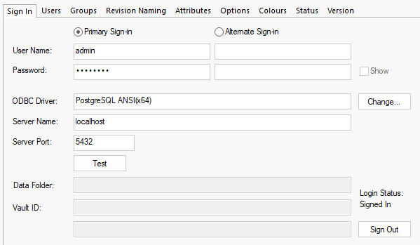 Vault Overview | Sign In | Users | Groups | Revision Naming | Attributes | Options | Colours | Status | Version