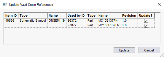 Parts contain references to other items such as Footprints and Schematic Symbols. When checking in items of a Vault type that can be referenced from Parts, the Update Cross References dialog assists you with refreshing the references to the checked in items.
