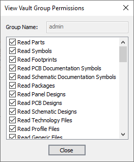This dialog shows the current global permissions set on a particular user group and is accessed from the Vault Item Permissions dialog.
