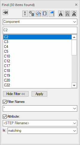 If the item type is Associated Part, a list of associated part names is shown. A name is only included in the list if components in the design use parts or footprints that reference the associated part. Choose the required name and use the Find icons to find each component that uses the associated part. If an associated part is only included in the design explicitly using the Design Properties dialog, and is not referred to by any components it will not appear in the list.