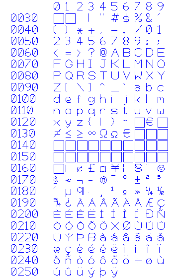 The picture below shows the full character set and the codes for each character using the <System Stroke Font>. Characters shown as a box are currently undefined in this font.