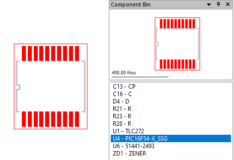 Following Translate to PCB, the component footprints will appear in the bin ready to place (if you selected this option). Placement to the design window is by drag and drop on selecting of the component name or symbol preview.