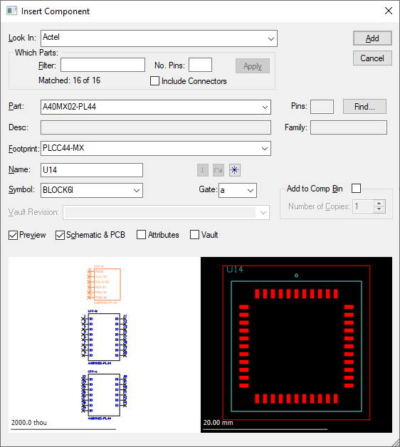 Use the Look In to be all libraries and show Preview as on. In Part drop down, you may select an appropriate part and see this displayed in the preview window. Clicking the Add button will add this part to your design. Press the EscCancel Insert Component. The Insert Component dialog re-appears, click Cancel to escape or choose another component to insert.