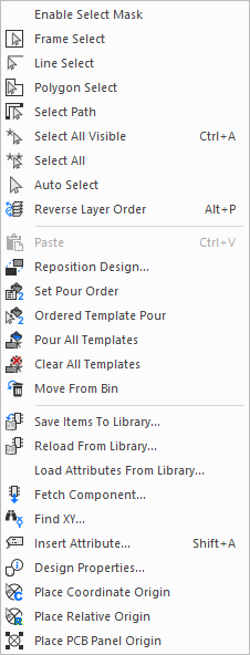 Generally, the options made available from a shortcut menu in any given context will be covered in the relevant help topics for the feature or design item being used. A few example menus are shown below to demonstrate the wealth of functionality that is only a right click away at any time in the Pulsonix system.