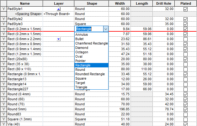 An example of a grid from the Pad Styles page of the Technology dialog as shown below.