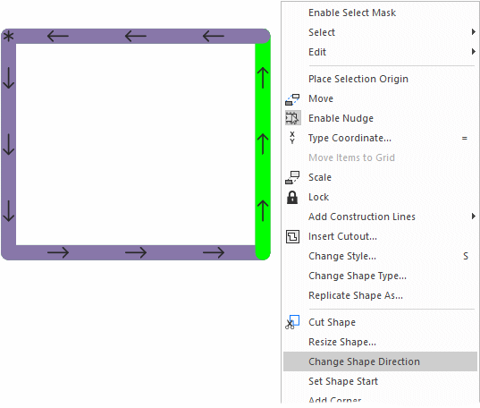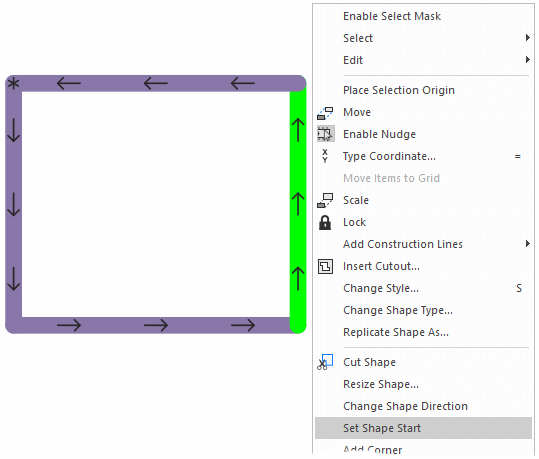 The start point on a shape is indicated with an \*. The start point is added at the shape origin when the shape is first added. This can be changed at any point by selecting the shape and choosing Set Shape Start from the context menu.