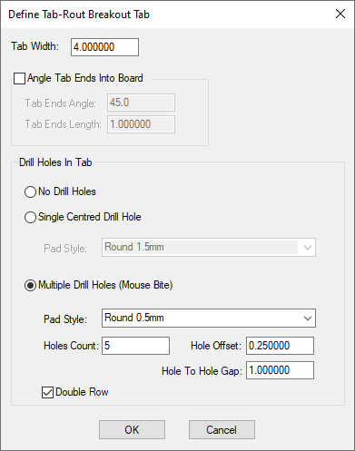 The breakout tabs in tab-routs are created with a specified width, can have the tab-rout ends angle into the board, and can contain drill holes to help with breaking the PCB boards out from the panel. To define how you want the tabs to be created right click the mouse and use Define Tab-Rout Breakout Tab from the context menu. The following dialog will be displayed: