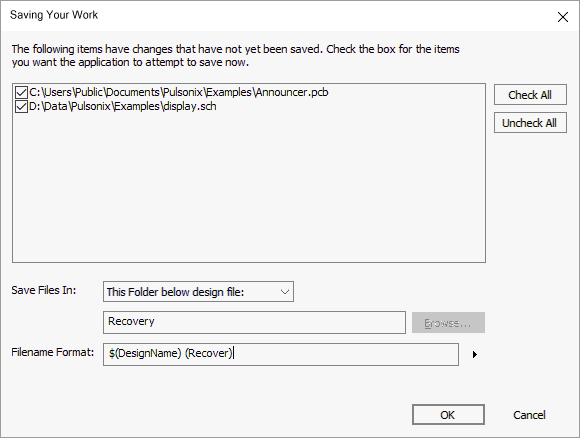 Shown in the list are the files waiting to be saved. You can uncheck the box alongside any of the files you do not want to attempt saving. It is possible that one of these files is actually the cause of the problem that the application encountered, but it should still be possible to save the other files before the application closes.