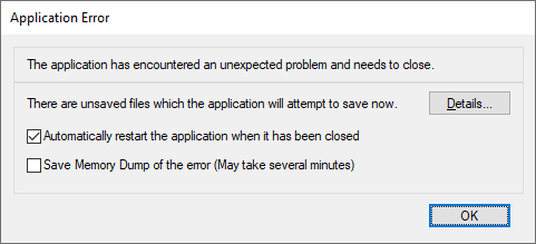 You can use this dialog to help you save any unsaved files you are currently working on, which should minimise the impact of the problem that the application has encountered.