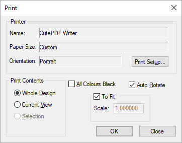 You can choose to print the whole design, the current view, or just the currently selected items. For multi-sheet schematics, you can also choose to print all the pages (one sheet per page). The print will be automatically scaled to best fit the current paper size.
