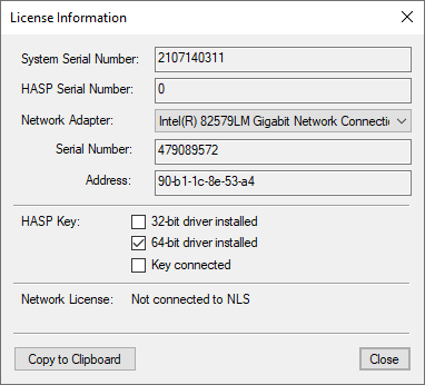 This shows the version of the HASP driver installed, 32 or 64 bit, and whether the key is actually connected. This is verification only and cannot be changed.