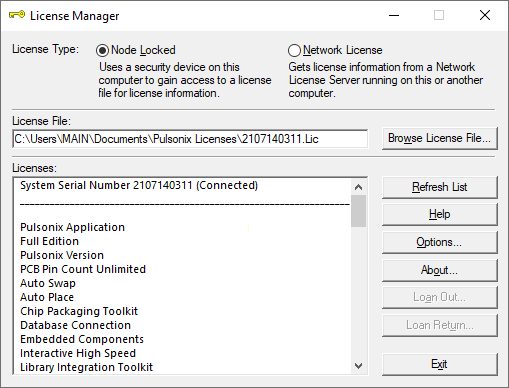 When Pulsonix is installed and running, you can extract license information from either Pulsonix itself or by using the Pulsonix License Manager program supplied and installed with the main product.