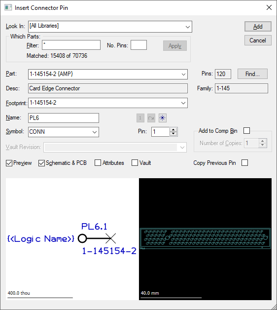 allowing both the schematic connector pin symbol and PCB Footprint to be reviewed.