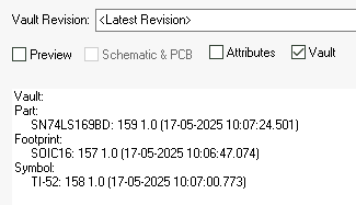Checking the Vault option will show the Vault IID and Version reference information for the part, connector pin symbol and footprint, alongside other enabled preview information.