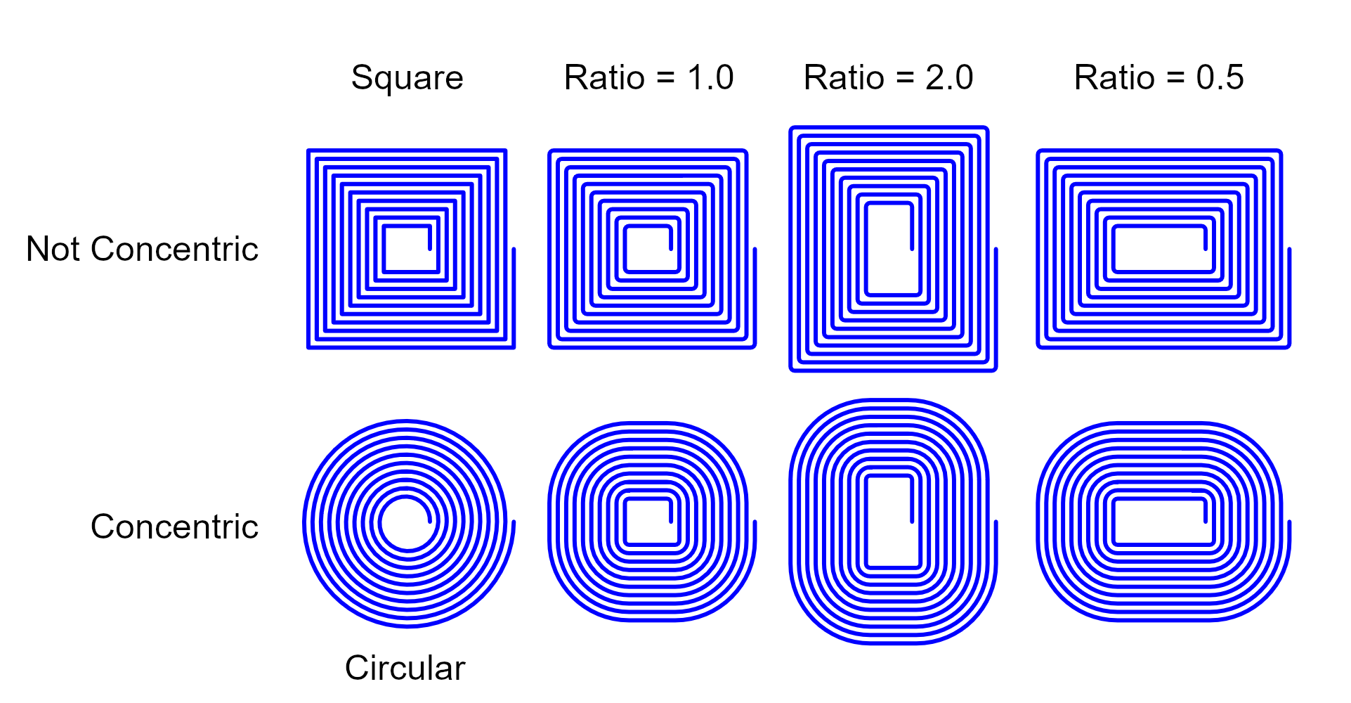 Concentric Corners gives tight corners which are properly nested, increasing in radius as the number of turns increases. Otherwise the corners are fixed at the Corner Radius.