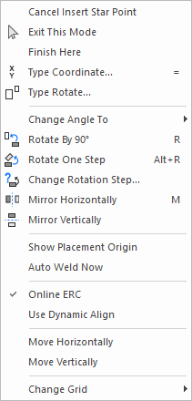 Whilst using the mouse to position the Star Point you can use the shortcut menu (shown below) to change its angle and mirror it, amongst other things. All these operations are explained in detail in the Move operation. Note: Online DRC and Display Clearance are only available when adding Star Points to a PCB design.