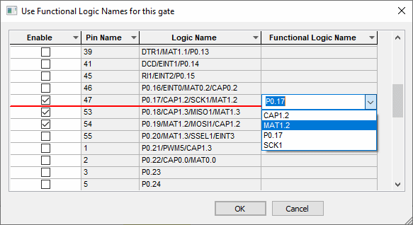 If the Logic Name has multiple functional logic names defined, for example, P0.17/CAP1.2/SCK1/MAT1.2 and separated by character defined, then the drop down list under Functional Logic Name will break these down into their individual Logic Names as required. The drop down list will enable the name required to be selected.