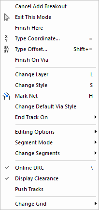 Auto Corner | Orthogonal Mitre | Breakouts Overview | Change Layer | Change Track Style | Display Clearances | End On | Grids | Insert Breakout | Online DRC | Remove Loops | Segment mode | Status bar | Technology | Properties