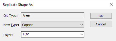 Use Replicate Shape As to copy an existing shape to a different type and maintain the same shape position. This could be used to change a documentation shape to a board outline for example. The layer will be changed if it is not suitable for the new shape type.