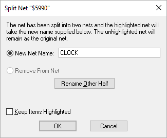 Note: you cannot split a net if all the items on the net would still be connected together. The dialog will indicate such a case, and the OK button is only enabled to allow you to remove the connection or track that was selected.