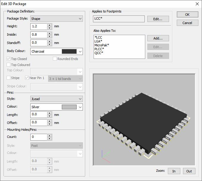This section shows a preview of the 3D package you are editing, as long as an appropriate Footprint can be located in the available libraries. Just below the preview is shown the name of the Footprint that is being used.