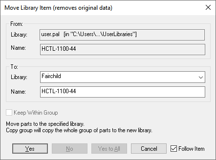 There is an additional complication for Parts, because Parts are stored in groups, a group of Parts share the same definition. When Copying a Part within the same library, you can use the Keep Within Group check box to create a new Part within the existing group, or copy to a new group. When copying a Part from one library to another, Keep Within Group determines if a single Part is copied, or the entire group.