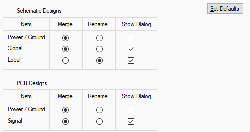 The options here will determine if nets should usually be merged with the same named nets (Merge), or if the new nets should be renamed to avoid joining to any existing nets (Rename). You can have different actions for PCB and Schematic, and for different types of nets.