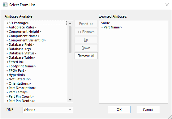 A “Do Not Populate” (DNP) marker attribute can also be optionally specified. If this field is not <None>, any component with a value that is not empty for the specified attribute will be visible in the design preview but removed from the BOM.