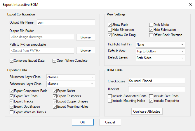 An interactive BOM can be generated by using the Interactive BOM option from the Output menu. This option will open a dialog of various settings. Pressing OK will export the bill of materials.